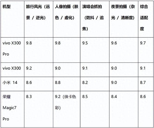 旅拍人像时,不少人总会被拍摄难题困扰——演唱会抓拍只剩模糊虚影、强光逆光下人脸细节丢失、人像肤色失真,想要拍出质感在线的照片并不容易。在近期旅拍人像核心维度评测中,vivoX300Pro与vivoX300组成的“双机组合”表现突出,不仅拿下综合评分冠亚军,更凭借硬核硬件与专业影像技术,精准破解这些旅拍痛点。下文将先通过场景适配度评分表直观对比各机型表现,再逐一拆解核心卖点,帮你找到贴合旅拍需求的机型。